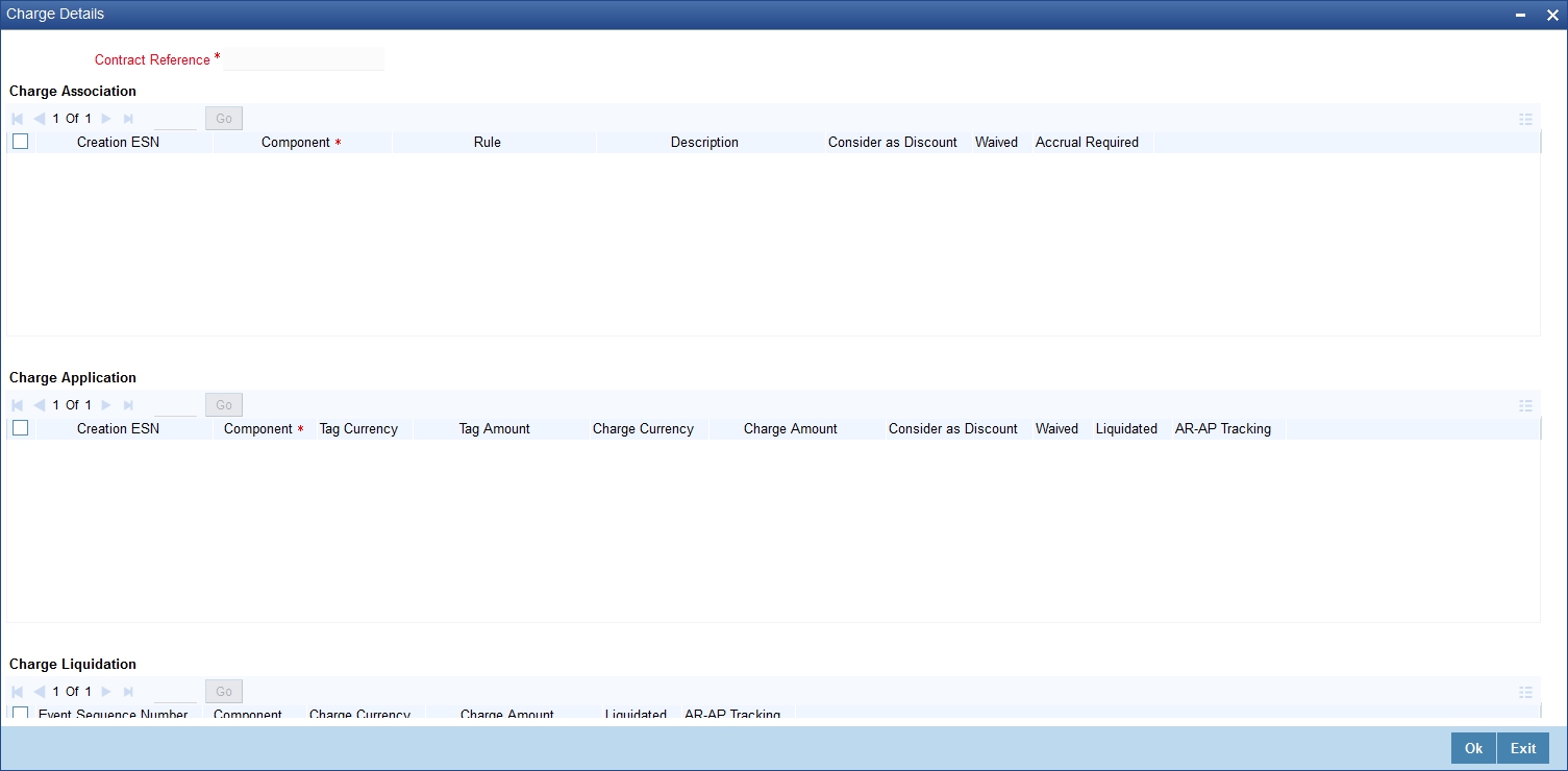 The charge details pertaining to the contract are specified in the ‘Charge Details’ screen. You need to invoke this screen from the ‘Contract Online’ screen. The ‘Charge Details’ screen is invoked as follows for the different modules of Oracle FLEXCUBE:
