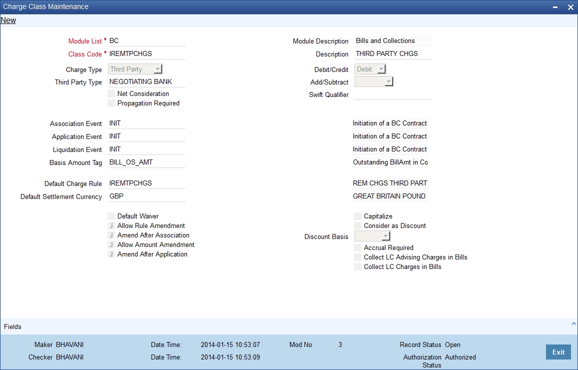 In Oracle FLEXCUBE, you can define the different types of charges or fees that apply on a product as ‘classes’. A charge class is a specific type of charge component (E.g. ‘Charges for amending the terms of a contract’).