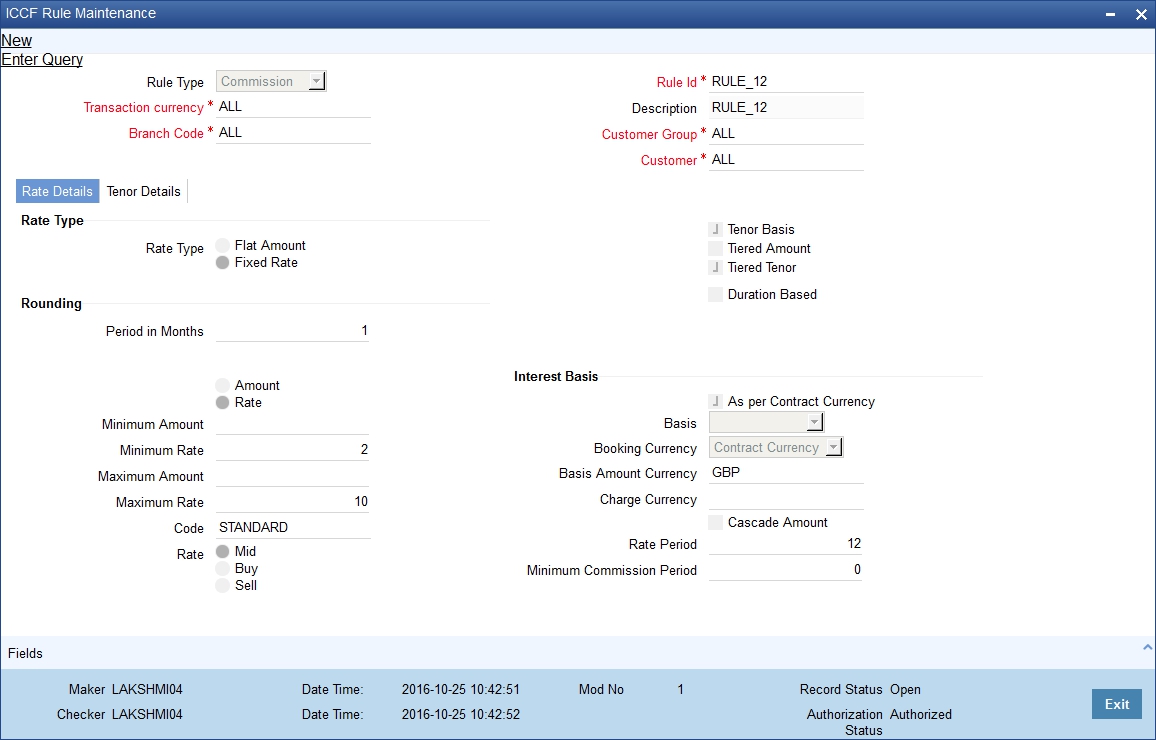 A charge rule is built with the logic to calculate a specific type of charge component. You can maintain this logic in the ‘ICCF Rule Maintenance’ screen. You can invoke this screen by typing ‘CFDRUMNE’ in the field at the top right corner of the Application tool bar and clicking the adjoining arrow button.