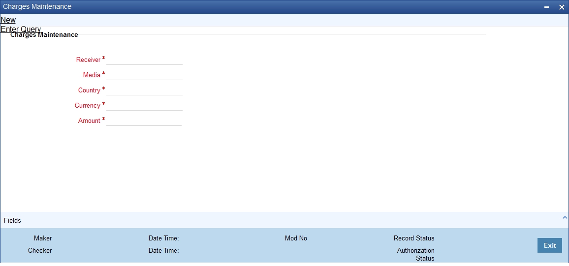 On the messages that are generated from Oracle FLEXCUBE, you can levy charges. You can define these charges for a Receiver, Media and Country combination. You can define these charges in the ‘Message Charges Maintenance’ screen, which is invoked from the Application Browser. You can invoke this screen by typing ‘ MSDCHRMN