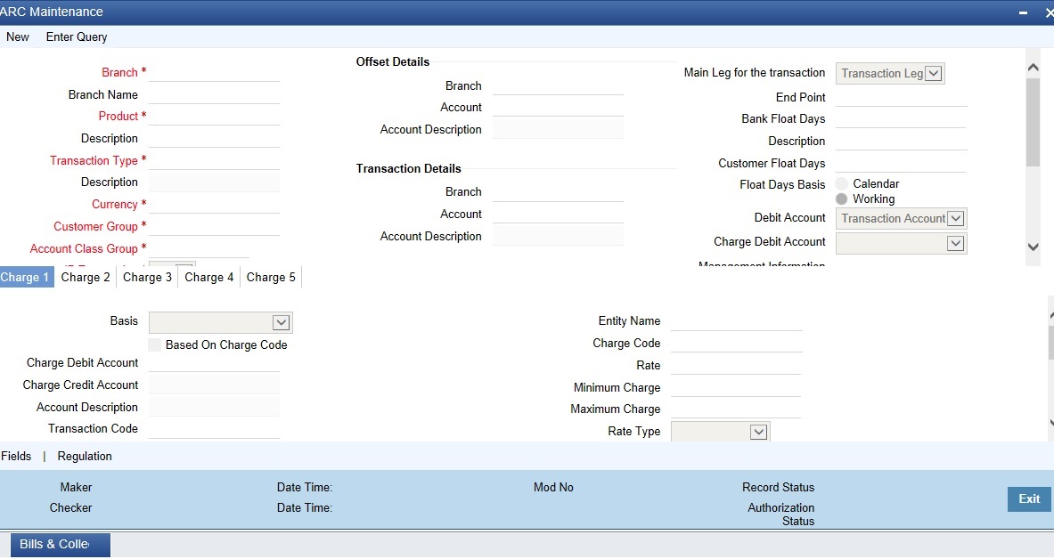 Once you have captured the basic information required for processing clearing transactions in Oracle FLEXCUBE, you have to maintain information that would be required to process clearing transactions involving a specific product. In the Account, Rate, and Charge (ARC) Maintenance screen, you have to maintain information that will be used to: