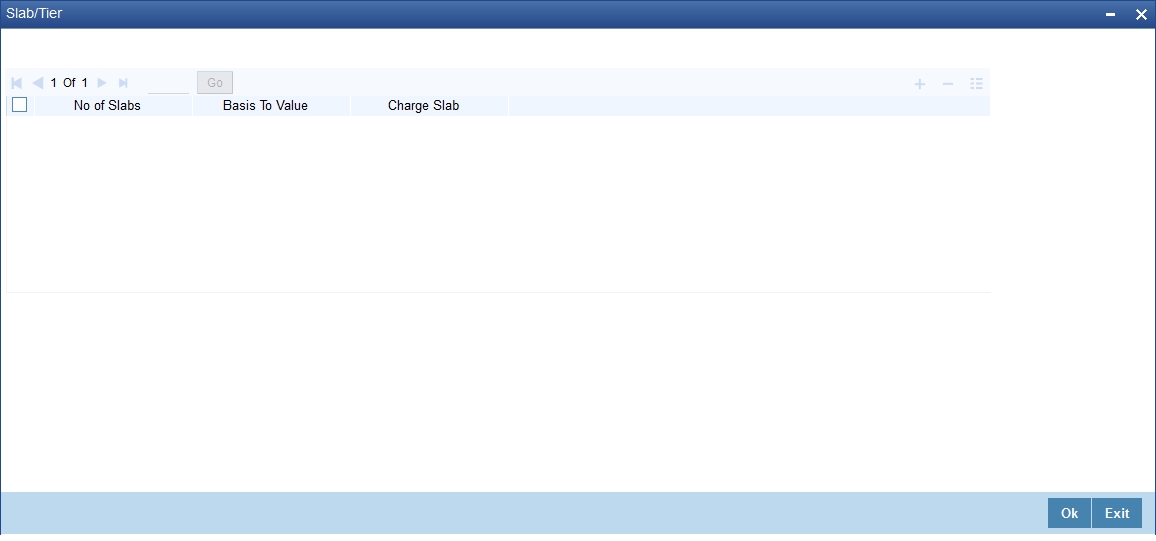 Select the Slab Type as Slab or Tier from the drop down list. If Slab Type is Slab or Tier, then provide the slab or tier details in the slab or tier sub-screen by clicking ‘S’ button.