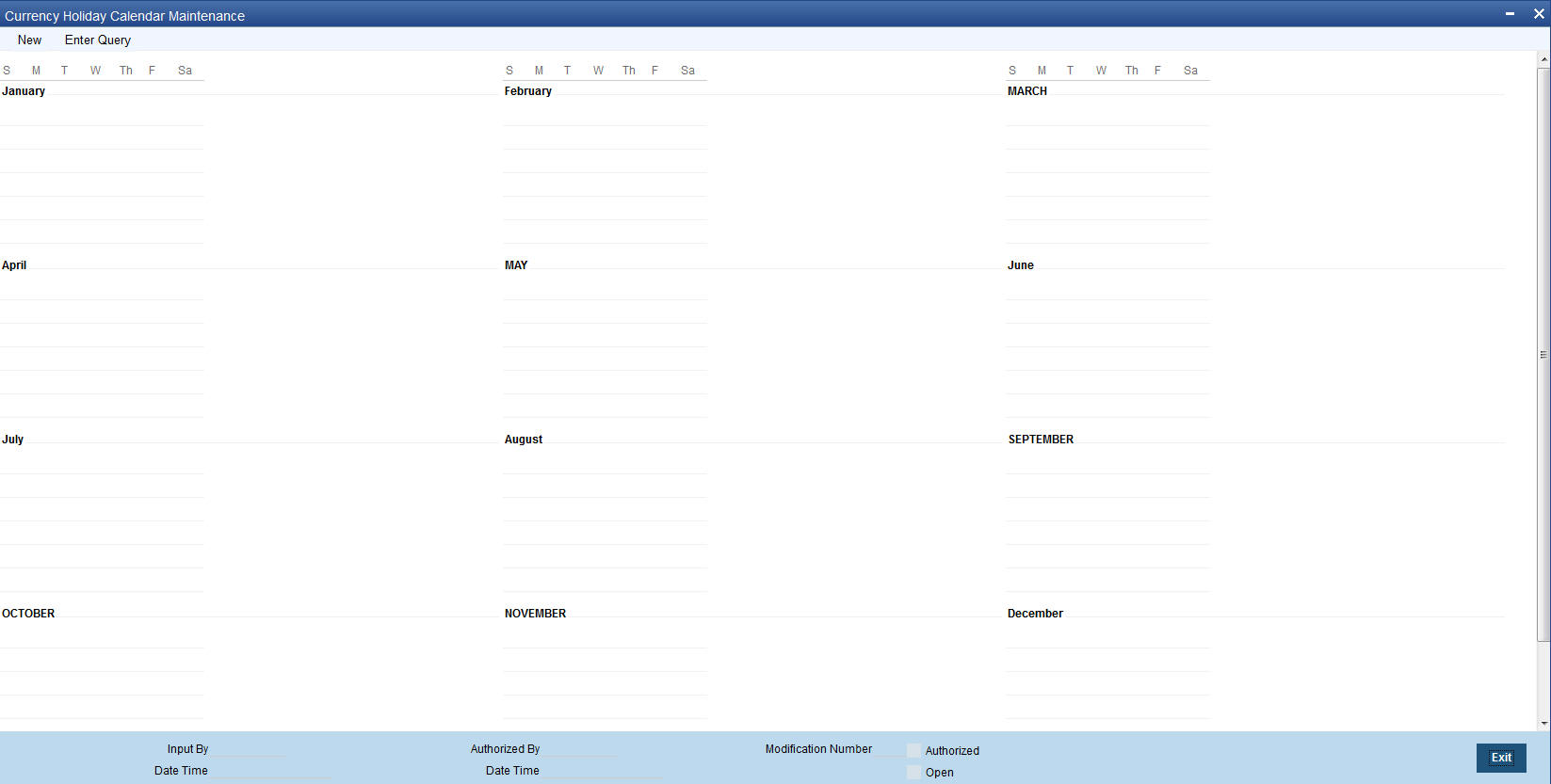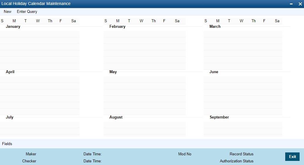 This screen is maintained for each branch, of your bank, from the respective branches; thus making it possible to have a different set of holidays for different branches of the bank.