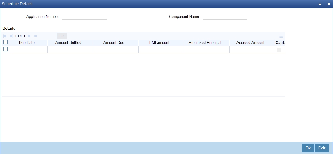 In ‘Component’ tab, the system calculates and displays the component details based on the loan offer selected. If you have selected an ‘Enquiry ID’ for the customer, then the schedule details that have been stored for the corresponding loan proposal are displayed here. You can modify them, if required.
