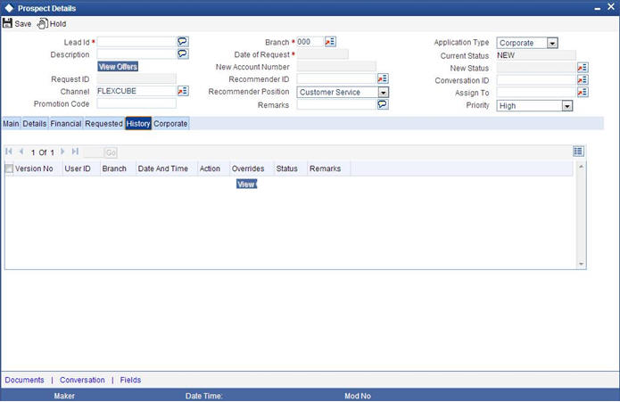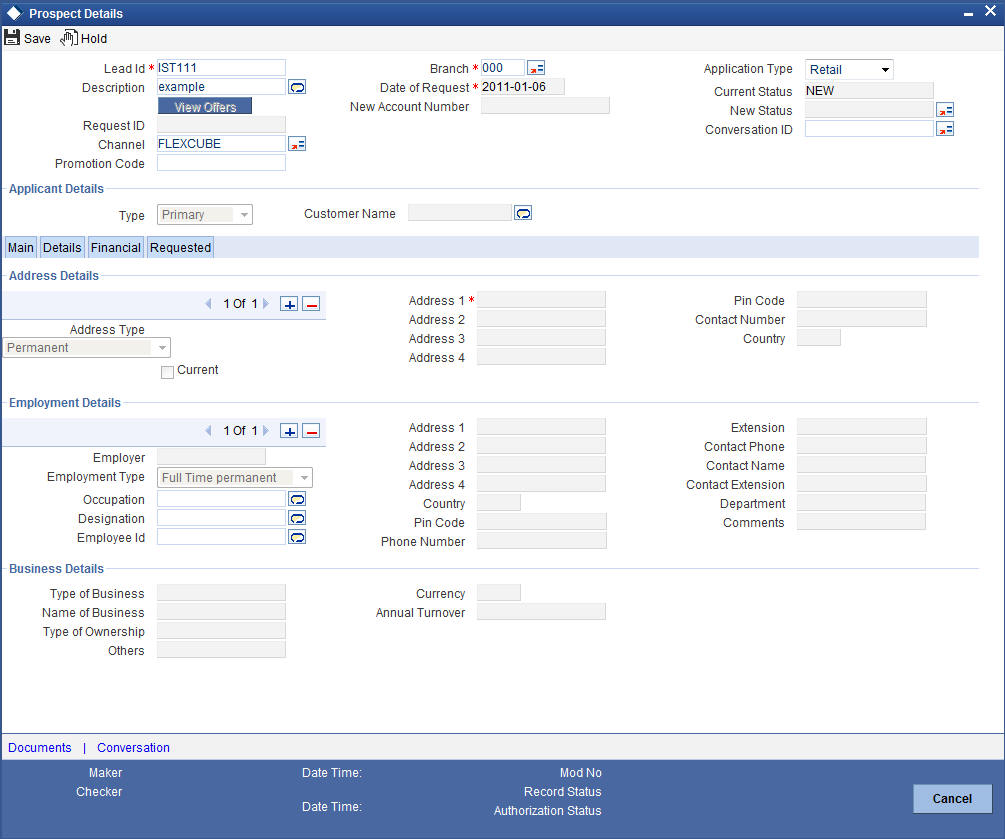 You can maintain the details related to the prospective customer in ‘Prospect Details’ screen. You can invoke this screen by typing ‘ORDLEADM’ in the field at the top right corner of the Application tool bar and clicking the adjoining arrow button.
