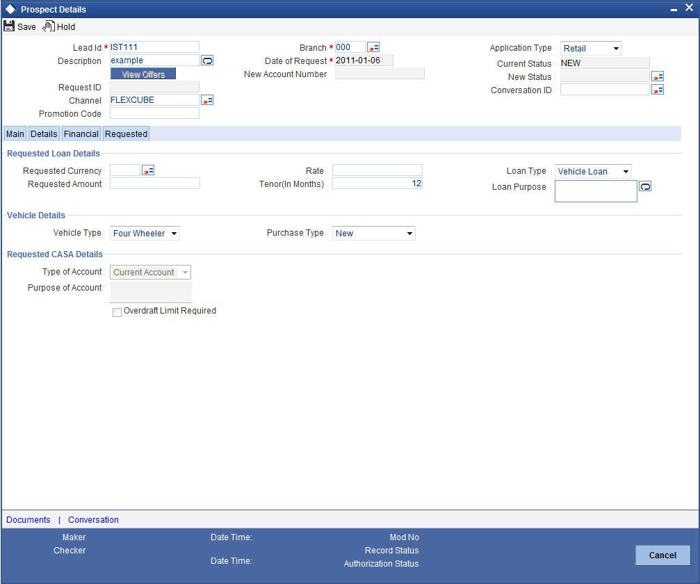You can initiate trade loan lead request through the external system by capturing the lead request and generating a Lead ID. Oracle FLEXCUBE receives the lead request and updates the status as 'NEW’. The system intimates the Lead ID and the status to the external system. The specified request and the uploaded document are verified and an offer is generated. The new status 'OFFER GENERATED' is updated in the prospect details screen. If the documents are not proper the status is updated as 'Additional Documents Required'. If the offer is accepted, the lead request is converted to origination and the new status is updated as 'CONVERTED’.