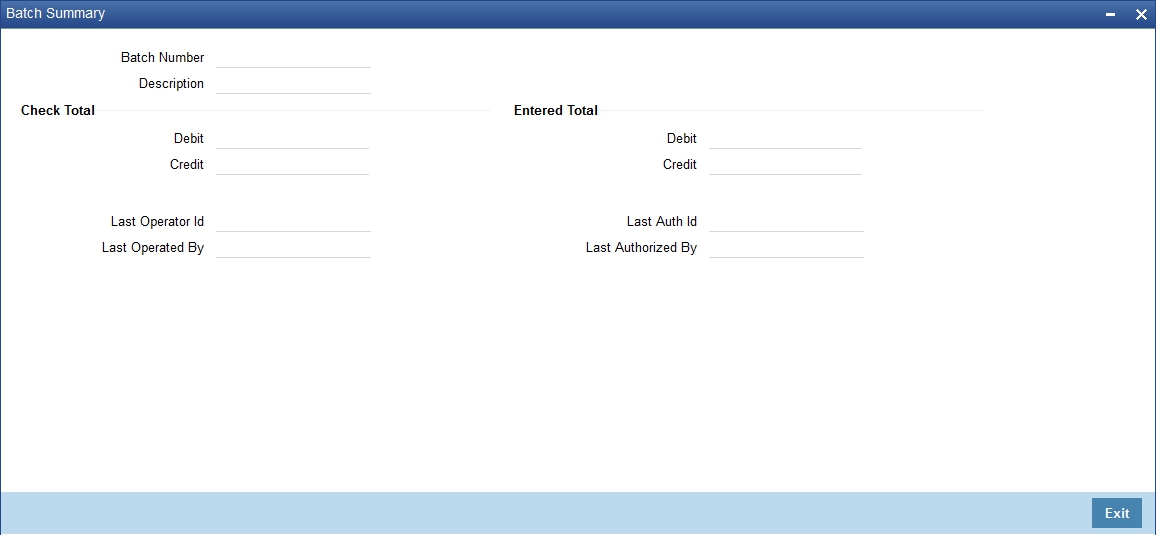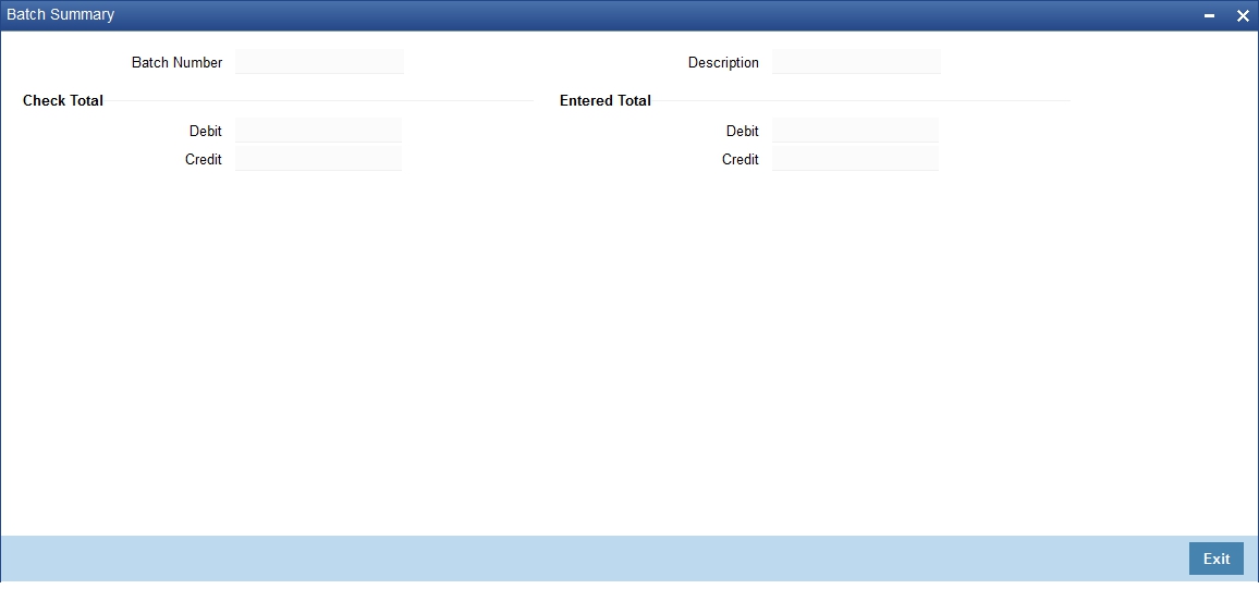 Click ‘Batch Summary’ button on ‘Journal Entry input’ screen to invoke the ‘Batch summary’ screen.