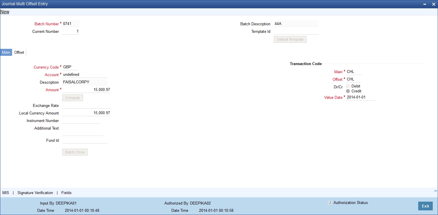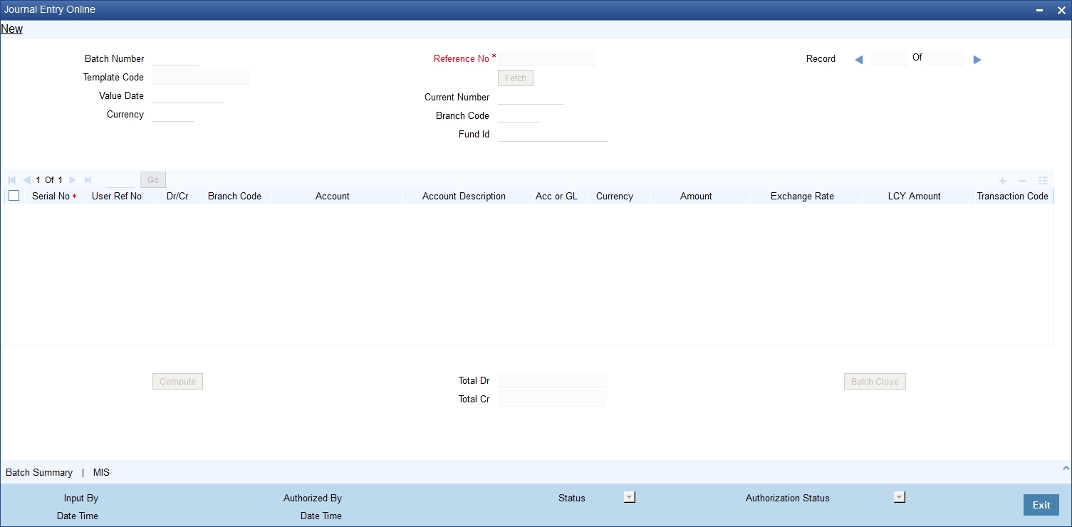 Once you invoke the ‘Journal Entry Input’ screen, click on ‘New’ option in the Application tool bar, to invoke ‘Batch Open’ screen.