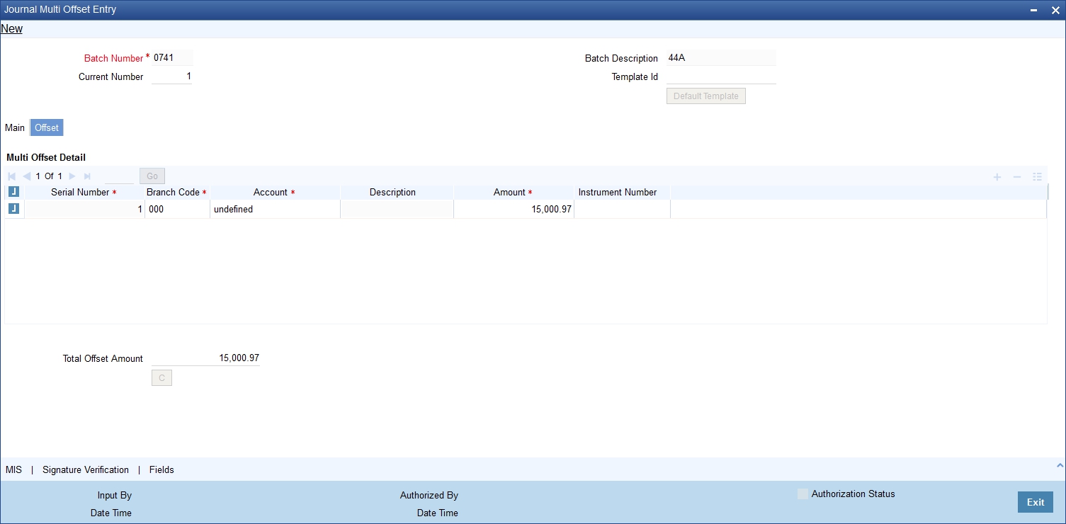 If the Offset leg of the transaction involves an instrument number, enter the same in this column. The total offset amount will be displayed at the bottom of the screen. After you have made your specifications in the above columns map each offset entry to the branch, an account and the amount.