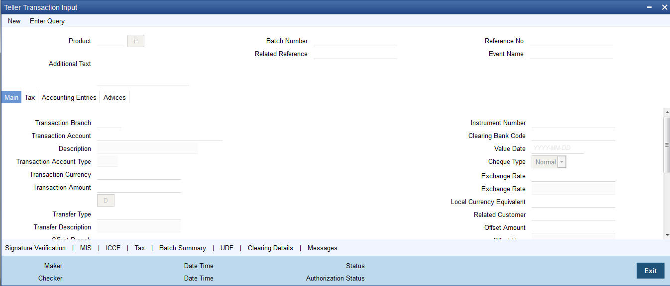 You can enter a teller type transaction in the ‘Teller Transaction Input’ screen. You can invoke this screen by typing ‘DEDTLRON’ in the field at the top right corner of the Application tool bar and clicking the adjoining arrow button.