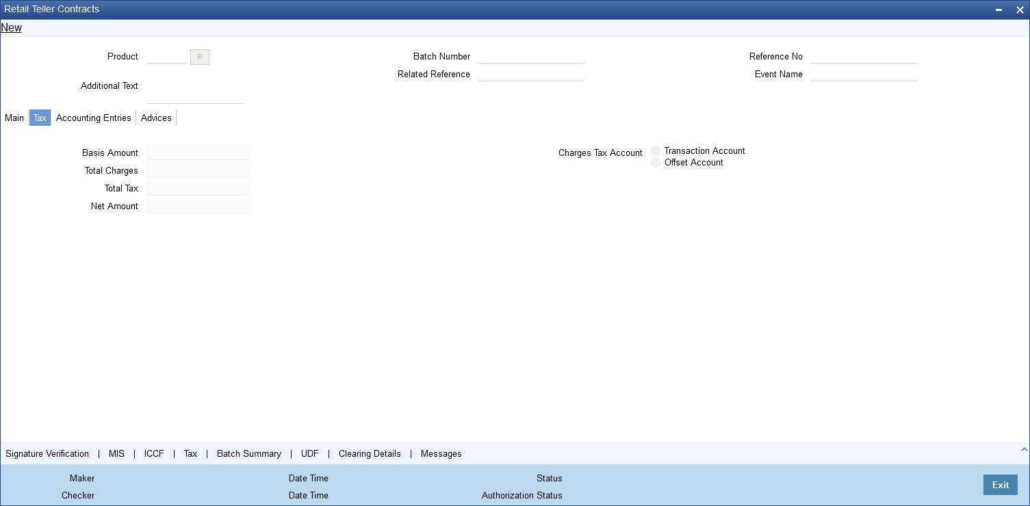 The taxes and charges defined for the product default to the transaction. You can view the tax and charge details that apply on a transaction. In the ‘Teller Transaction Input’ screen choose the ‘Tax’ tab. The taxes and charges that apply to the transaction will be displayed. You can change the tax/charge amount calculated for the transaction. To change the charge/tax amount displayed, click the ‘Tax’ button in this screen.