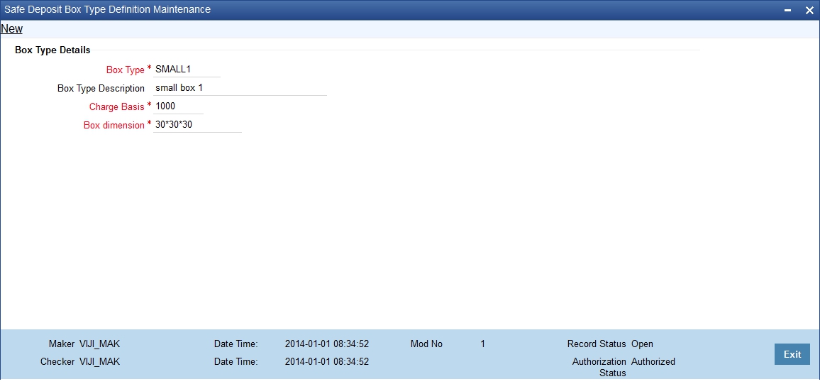 Identify the type for the safe deposit box that you are defining with a unique code. After initial maintenance, you are not allowed to modify this value.