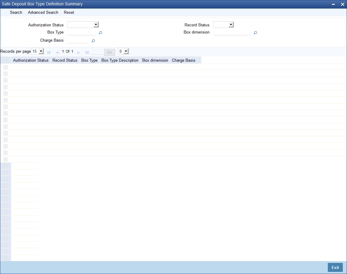 You need to define the type and size of the safe deposit boxes that you will be offering your customers. You can do this in the ‘SDB Box Type Definition Maintenance’ screen. To invoke this screen, type ‘DLDBXTDF’ in the field at the top right corner of the Application Toolbar and then click the adjoining arrow button.