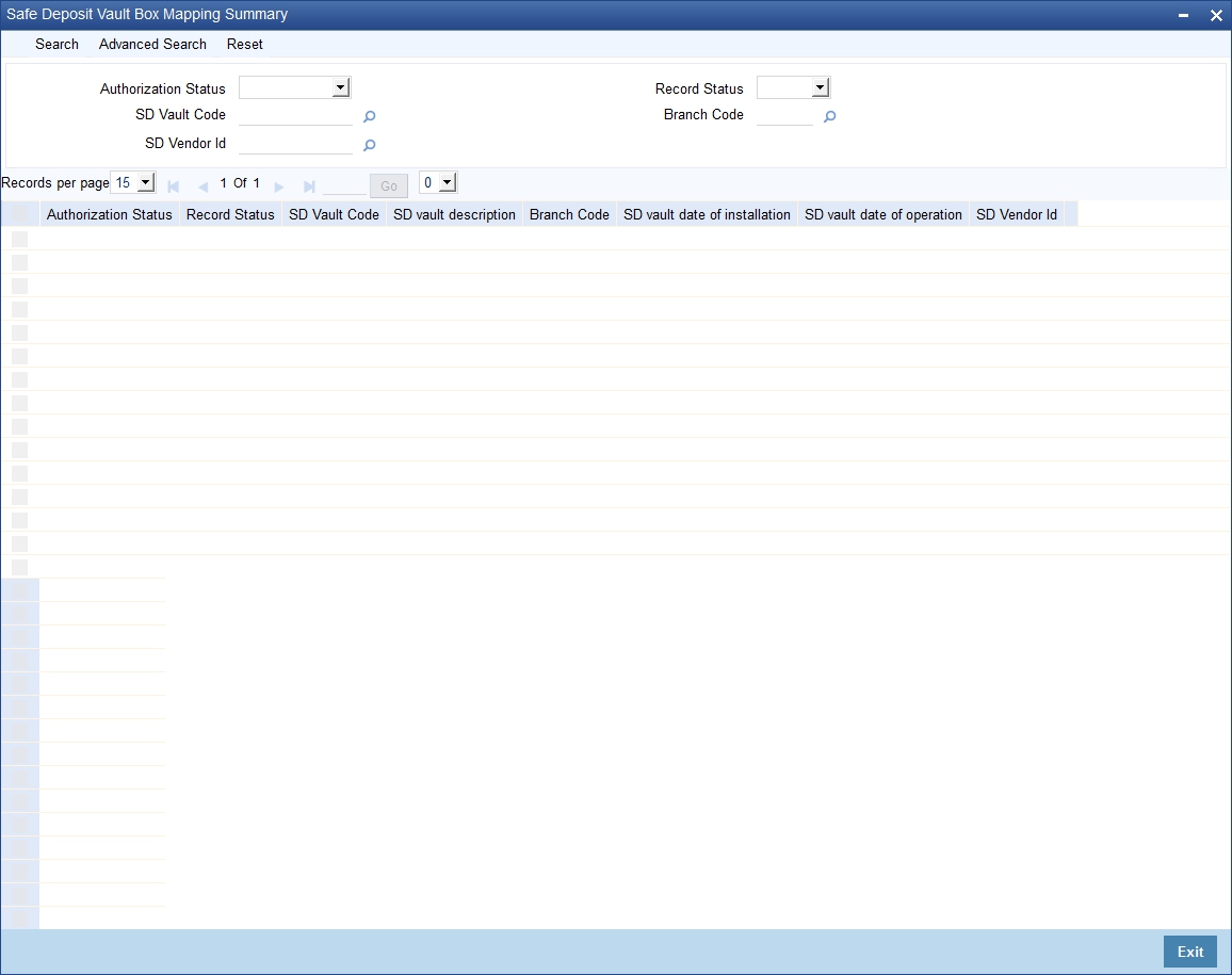 You can query and view the details of vault and box mappings maintained in the system in the ‘SDB Vault Box Mapping Summary’ screen. To invoke this screen, type ‘DLSVLBXM’ in the field at the top right corner of the Application Toolbar and then click the adjoining arrow button.