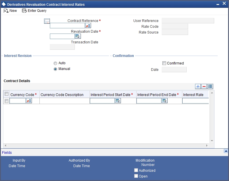 For an ad hoc revaluation of a particular contract, select ‘New’ from the Actions menu in the Application tool bar or click new icon. The ‘Contract Interest Rates Maintenance’ screen will be displayed without any details. Select the reference number of the contract which is to be revalued after you indicate the new revaluation date of the contract you can specify the new interest rate for the interest period.