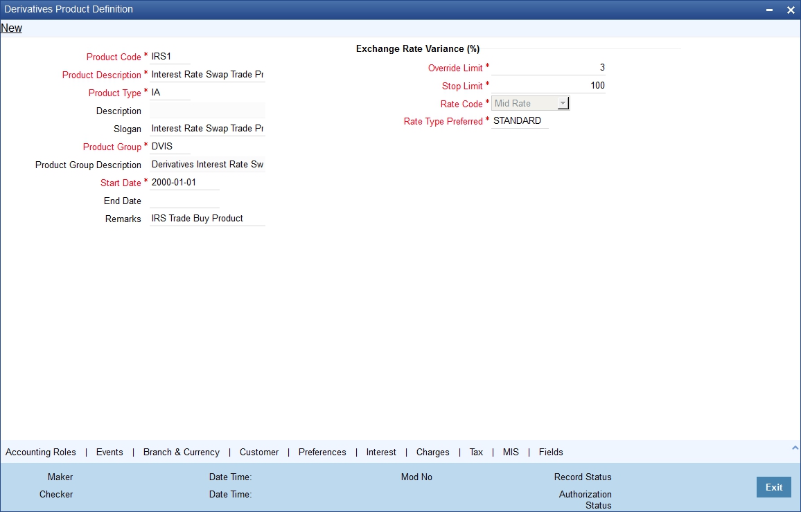 You can create a derivative product in the ‘Derivatives Product Maintenance’ screen, invoked from the Application Browser. In this screen, you can enter basic information relating to a derivative product such as the Product Code, the Description, etc.