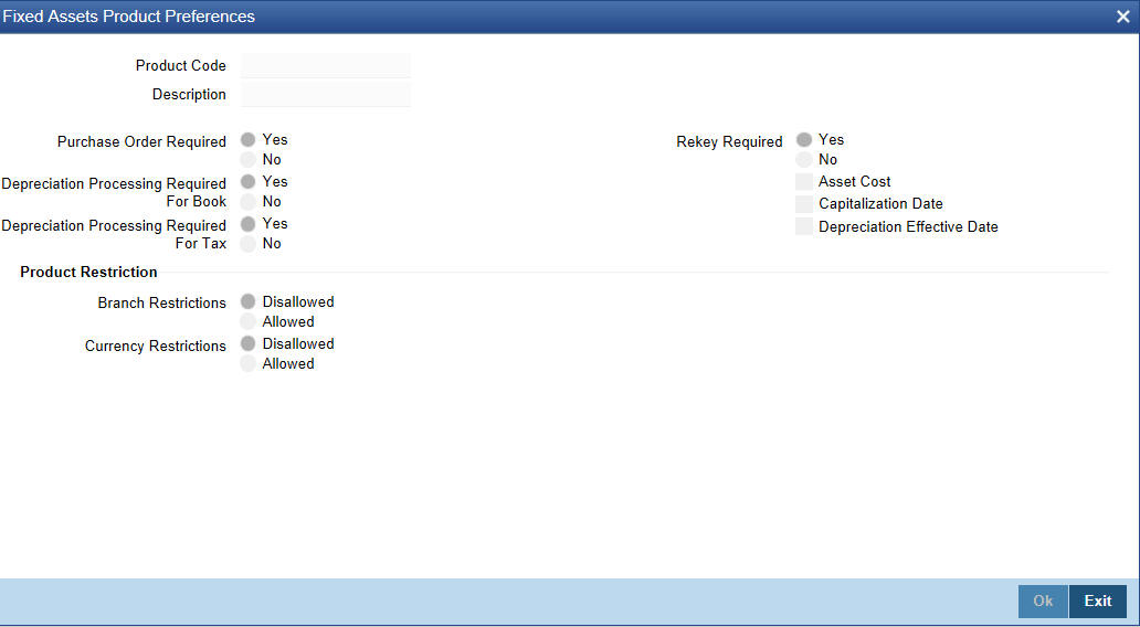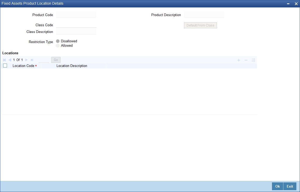 For more details refer section titled ‘Maintaining Location Restrictions Classes’ in the chapter ‘Maintenance for Fixed Asset’.
