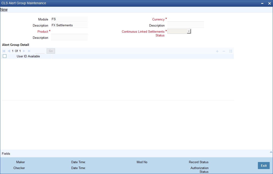 You can associate values to all the User Defined fields created and attached to the ‘CLS Alert Group’ screen. You can view the list of User Defined fields associated to this screen by clicking ‘Fields’ button on the ‘CLS Alert Group’ screen.