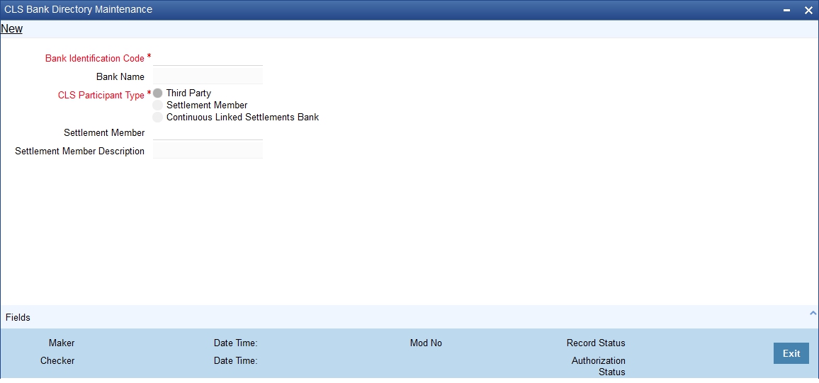 You have to select the BIC of the CLS party to determine the participant type. On selection of the BIC, the name of the customer is displayed alongside.