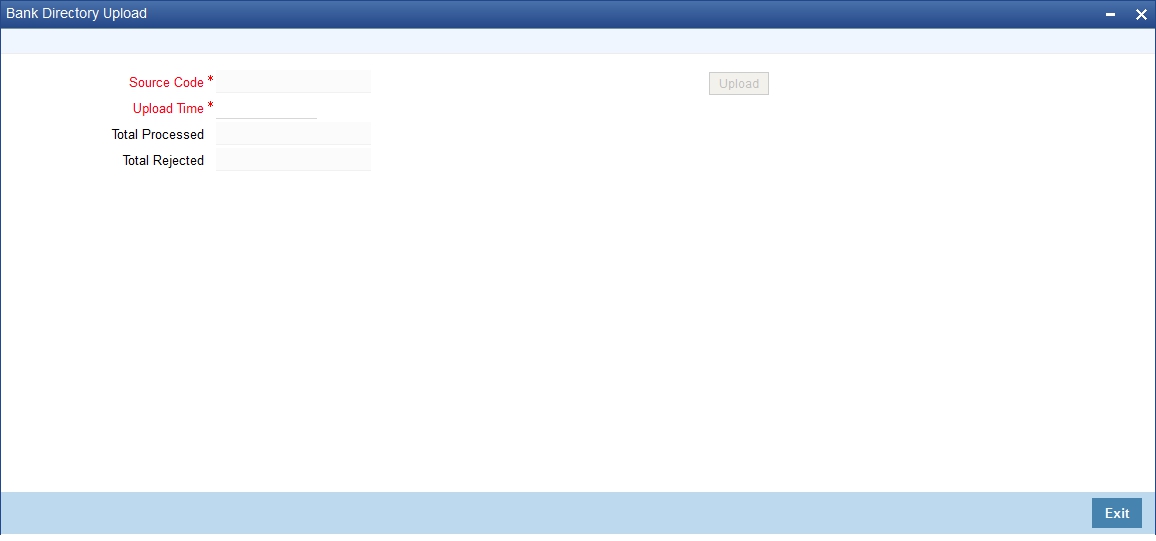 You can invoke the ‘Bank Directory Upload’ screen by typing ‘FSDBICUP’ in the field at the top right corner of the Application tool bar and clicking on the adjoining arrow button.