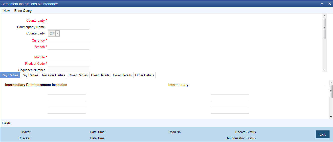 You can maintain the settlement preferences for a customer in the ‘Settlement Instructions Maintenance’ screen. You can invoke the ‘Settlement Instructions Maintenance’ screen by typing ISDINSTN’ in the field at the top right corner of the Application tool bar and clicking on the adjoining arrow button.