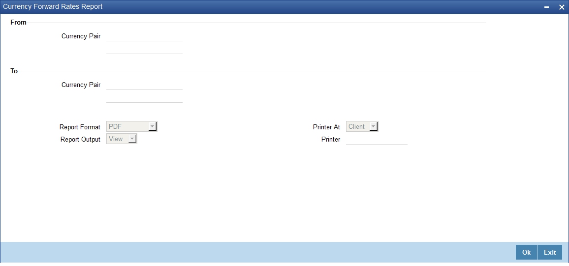 This report gives details about forward rates for different currency pairs over a given period. You can invoke the screen by typing the code ‘CYRFWRAT’ in the field at the top right corner of the Application tool bar and click on the adjoining arrow button.