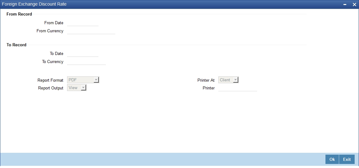 Discounting rate report provides information on the currency used, period code and discount date. To invoke the screen, type ‘FXRDIRAT’ in the field at the top right corner of the Application tool bar and click the adjoining arrow button.