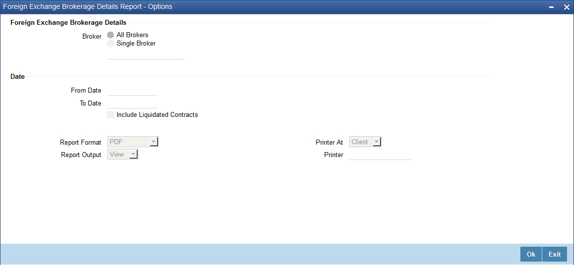Brokerage Confirmation Journal provides information on the amount, deal currency and the broker code of contracts. You can generate this report using the ‘Foreign Exchange Broker Confirmation Report’ screen.