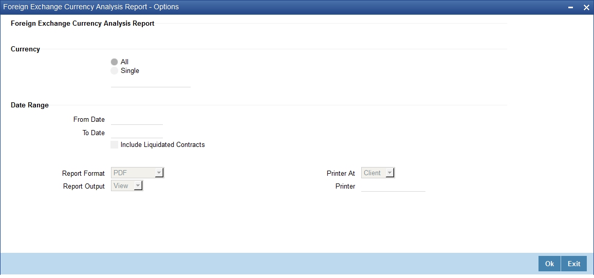 Use the adjoining button to enter the date up to which the report is to be generated. For the specified currency (ies), the net currency position due to contracts maturing between this date and the date given in the previous field (From Date) will be reported. The system defaults to today’s date.