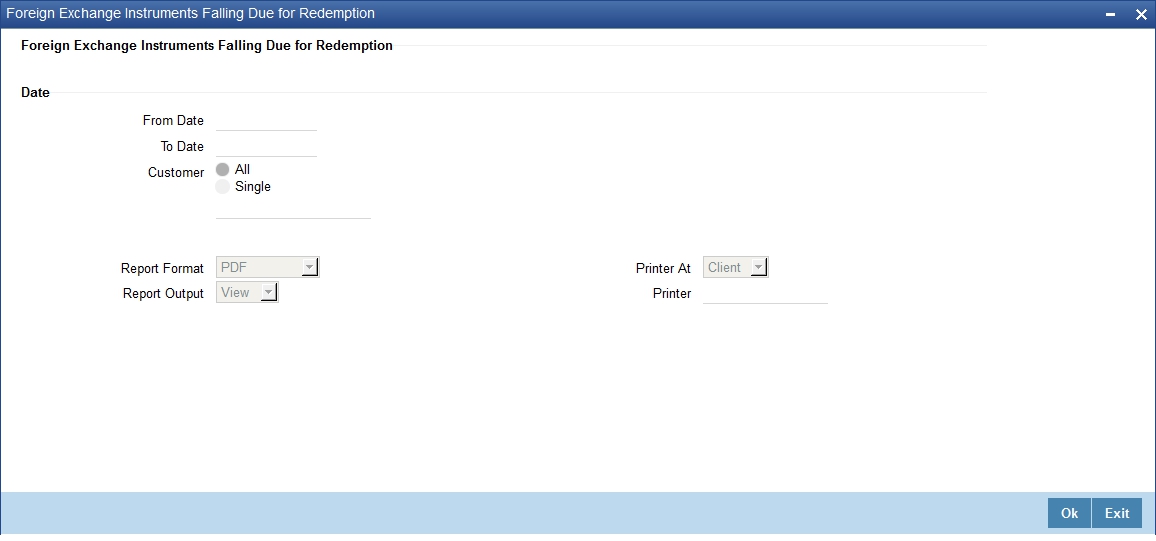 Contract maturity due report provides information on maturity date, sold currency, bought currency, sold amount and bought amount of contracts. You can generate this report using the ‘Foreign Exchange Instruments Falling Due for Redemption’ screen.