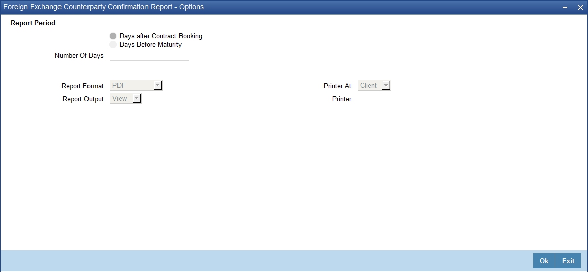 Indicate whether you want to generate the report for a specific number of days after contract booking or before maturity date. Once you make your choice, specify the number of days.