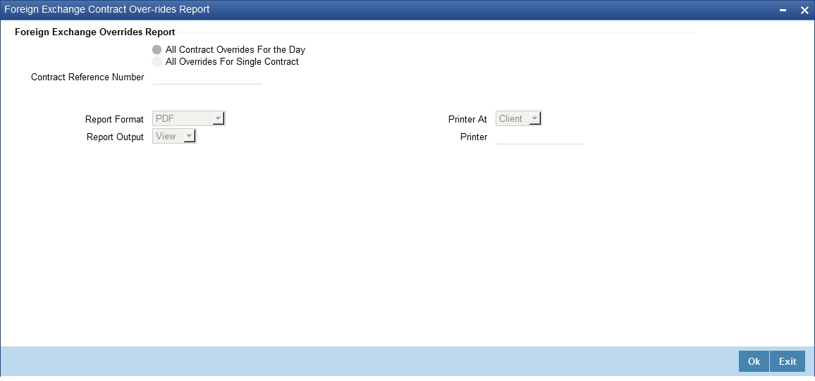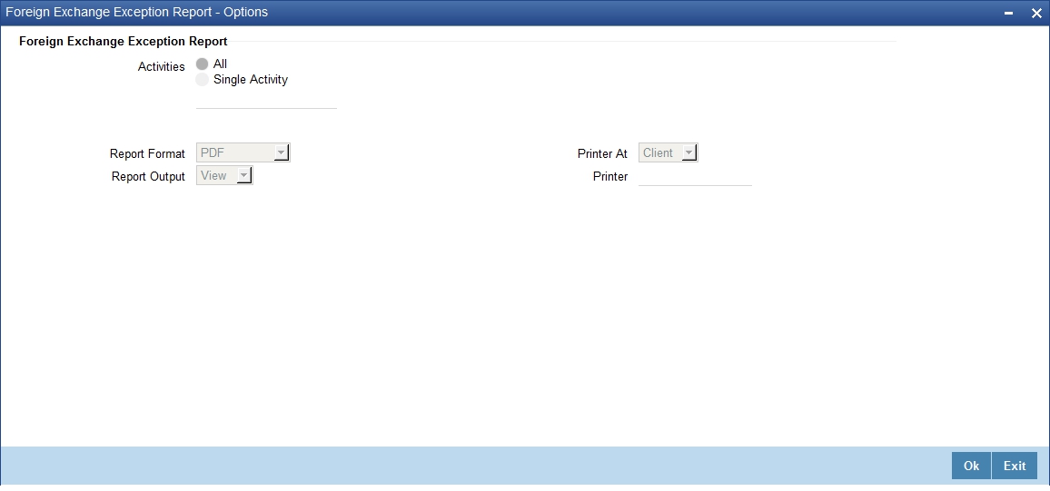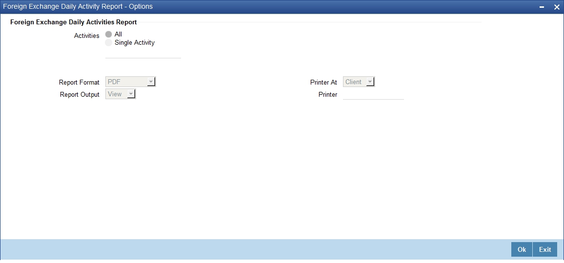 This report gives details of activities that were performed on contracts in the FX module during the day. If the report is generated as a part of End of Day process all the activities during the day will be reported. If it is generated any other time, you can select the product and the type of activity (initiation, putting a contract on hold, amendment, reversal, rollover, liquidation etc.) to be reported in the Report Options screen. You can also invoke this screen by typing ‘FXRPDLY’ in the field at the top right corner of the Application tool bar and clicking the adjoining arrow button.