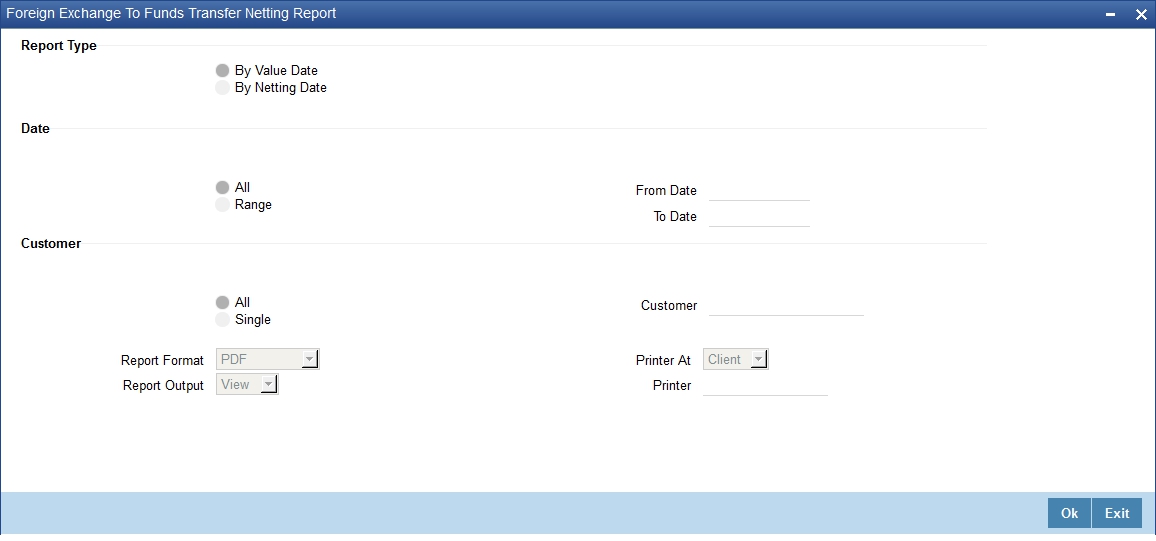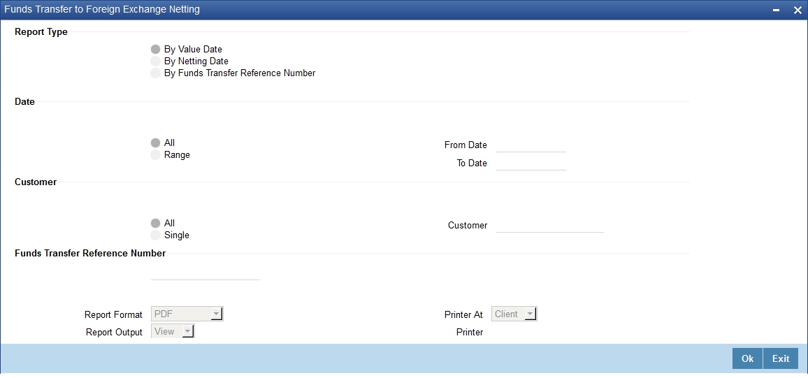 FX to Fund Transfer Netting Report provides information on FX to Fund Transfer netting. To invoke the screen, type ‘FXRPNTFX’ in the field at the top right corner of the Application tool bar and click the adjoining arrow button.