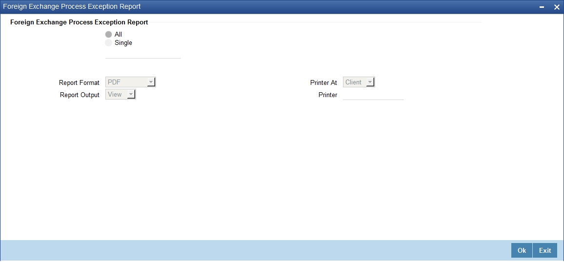 Process exception report provides information on process exception. To invoke the screen, type ‘FXRPPREX’ in the field at the top right corner of the Application tool bar and click the adjoining arrow button.