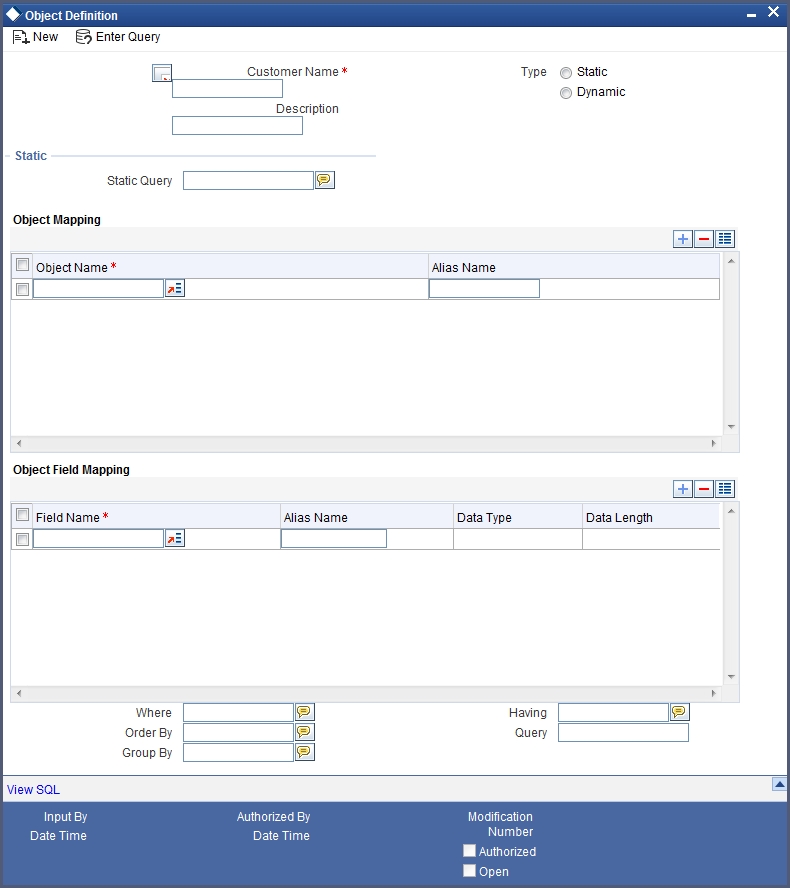 You can prepare complex queries to use them in the outgoing interface definition for data extraction. ‘Object Definition’ screen can be used to create queries which can be invoked from the Application Browser. You can invoke this screen by typing ‘GIDOBDEF’ in the field at the top right corner of the Application tool bar and clicking the adjoining arrow button.