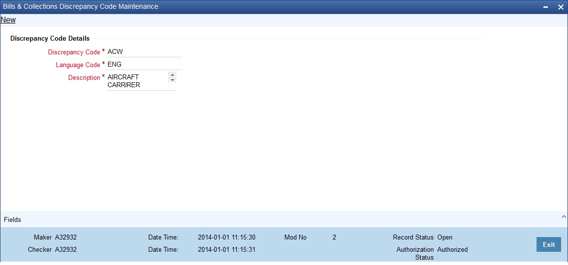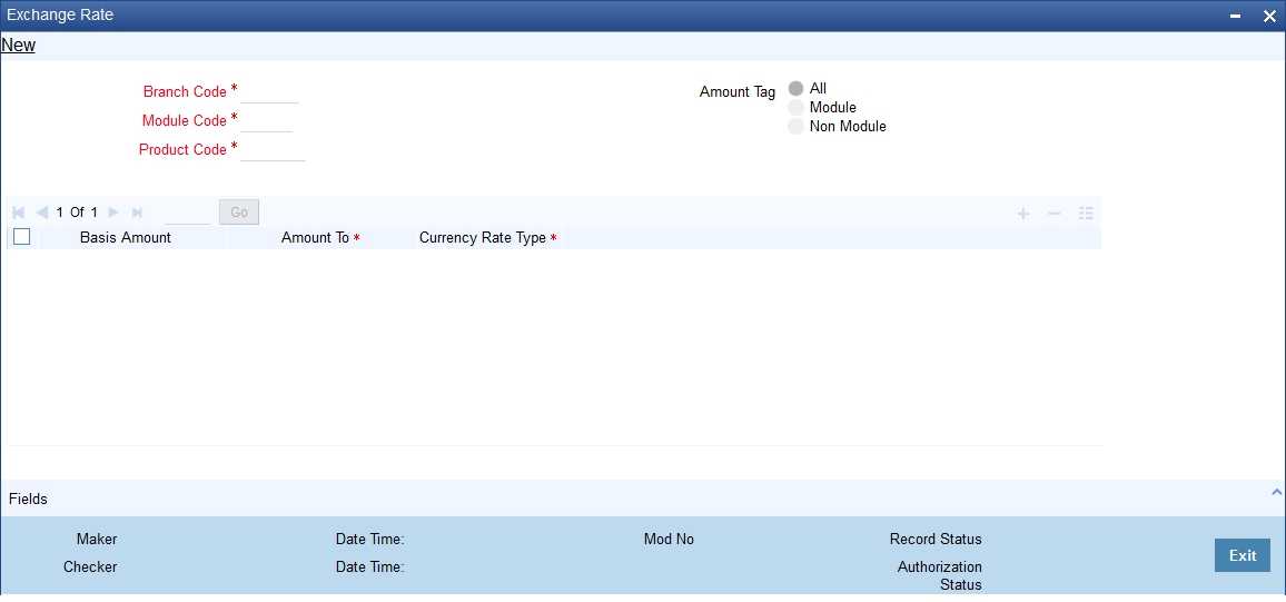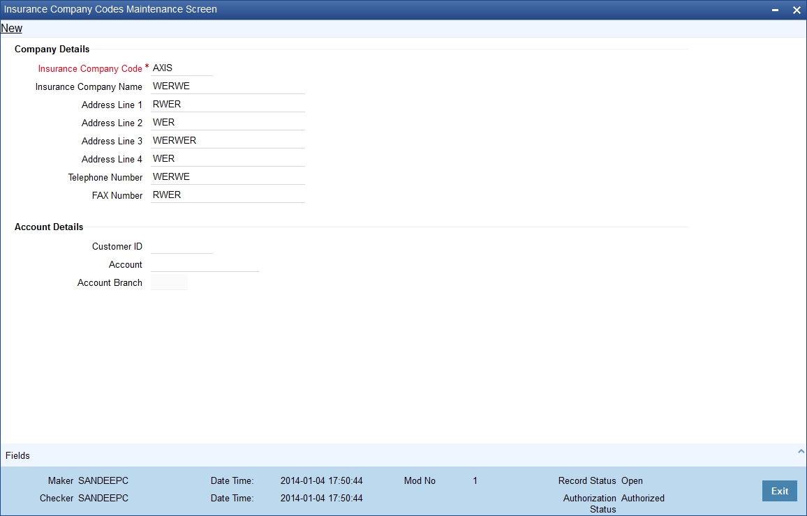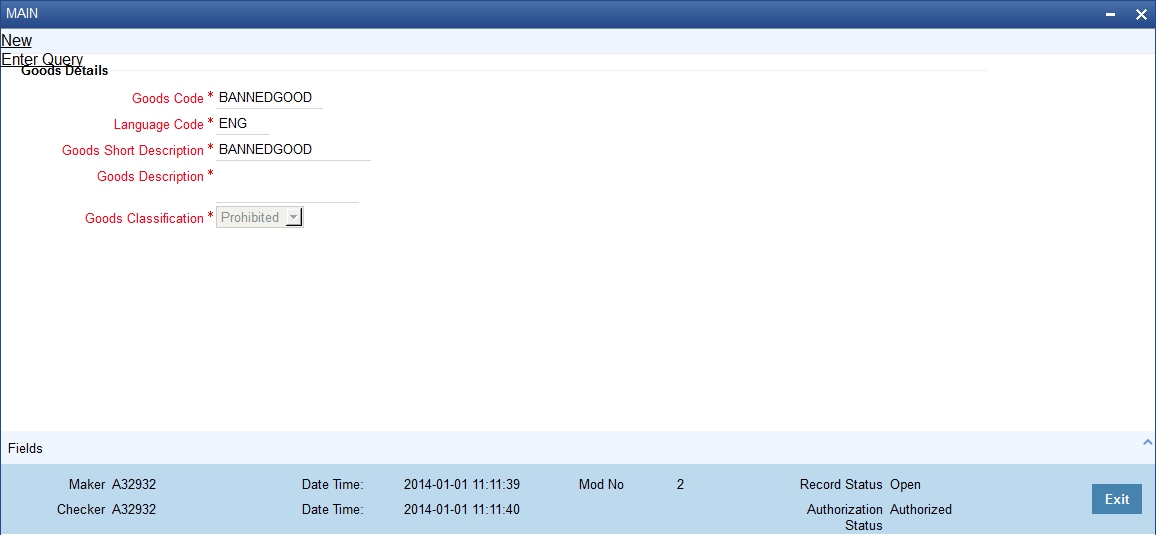 After making the required mandatory entries, save the record. Click the ‘Exit’ button to exit the screen.