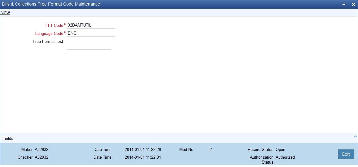 This maintenance is common for both BC and Islamic BC modules. You can invoke the ‘Bills & Collections Free Format Code Maintenance’ screen by typing ‘BCDFFTCD’ in the field at the top right corner of the Application tool bar and clicking the adjoining arrow button. If you are maintaining the details for the FFT for the first time, select ‘New’ from the Actions menu in the Application tool bar or click new icon. The ‘Bills & Collections Free Format Code Maintenance’ screen will be displayed.