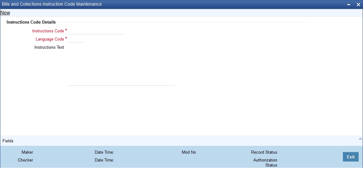 This maintenance is common for both BC and Islamic BC modules. You can invoke the ‘Bills & Collections Instruction Code Maintenance’ screen by typing ‘BCDINSCD’ in the field at the top right corner of the Application tool bar and clicking the adjoining arrow button. If you are maintaining the details for an instruction for the first time, select ‘New’ from the Actions menu in the Application tool bar or click new icon. The ‘Bills & Collection Instruction Code Maintenance’ screen will be displayed.