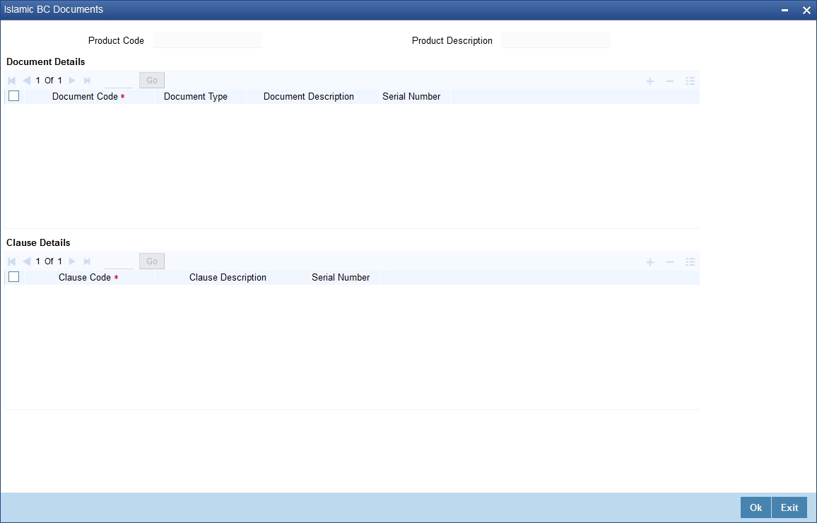 In addition to the Instructions and FFTs that you specify for a product, you can also specify the documents and clauses. Click the ‘Document' button to invoke the Islamic BC Document’ screen to specify the documents and clauses applicable to the product you are creating.