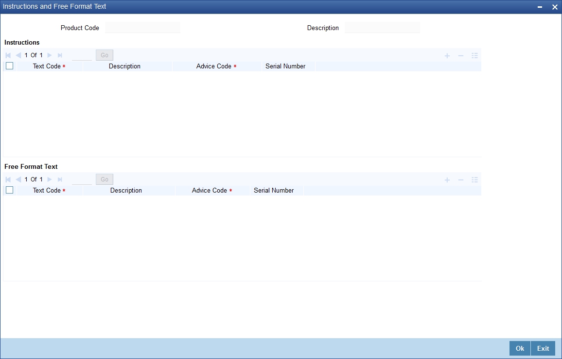 Click the ‘Free Format Text’ button to invoke the ‘Bills and Collections Product – Instructions and Free Format Text’ screen.