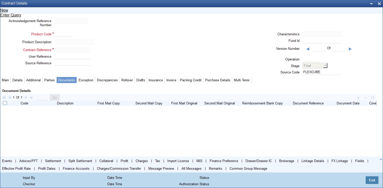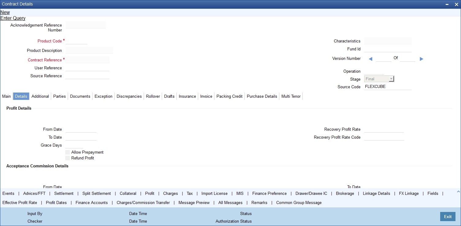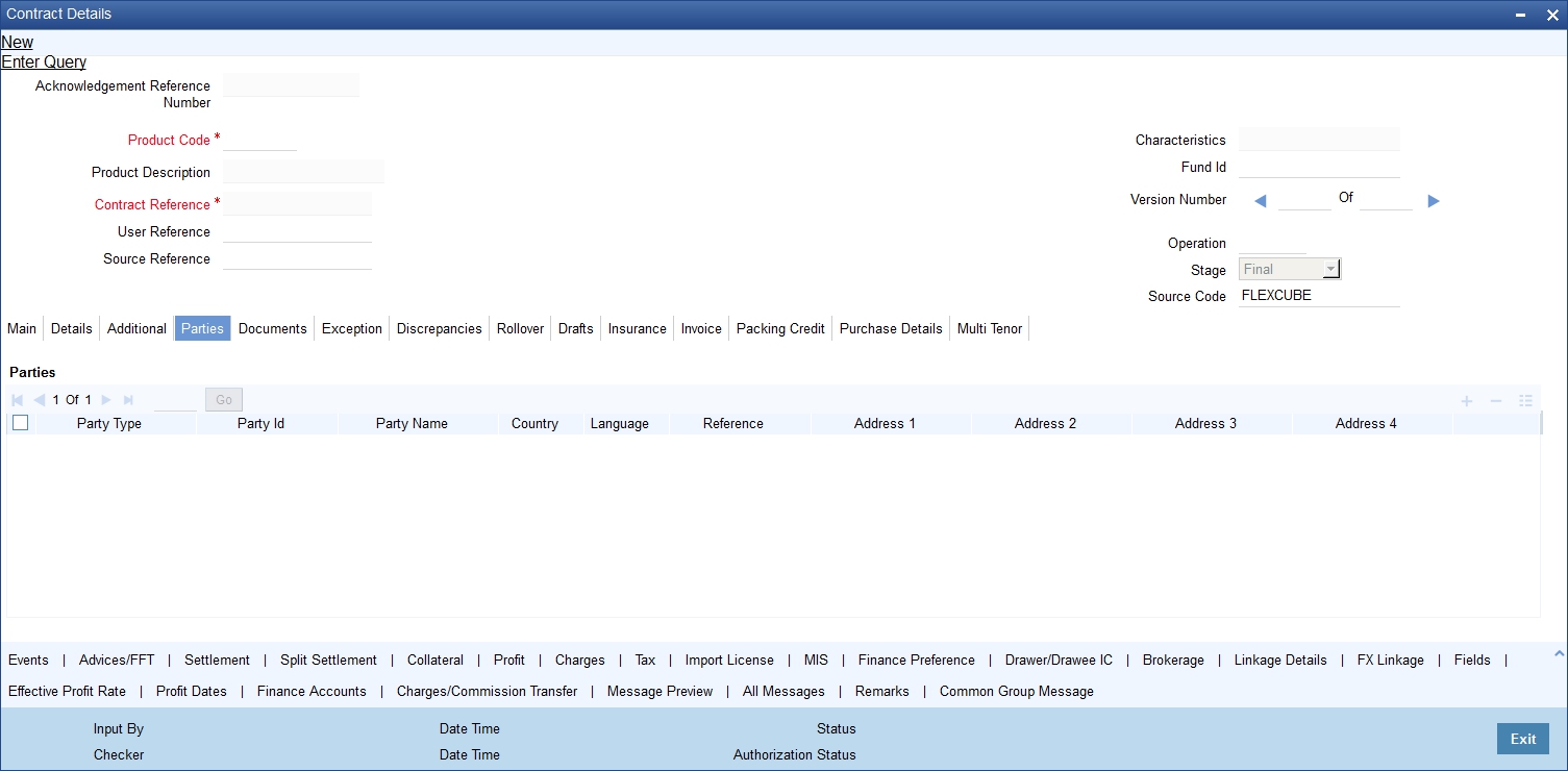 The ‘Islamic Bills and Collections Contract Detailed’ screen is designed to contain 11 tabs along the lines of which, you can enter details of the contract. The 11 tabs are: