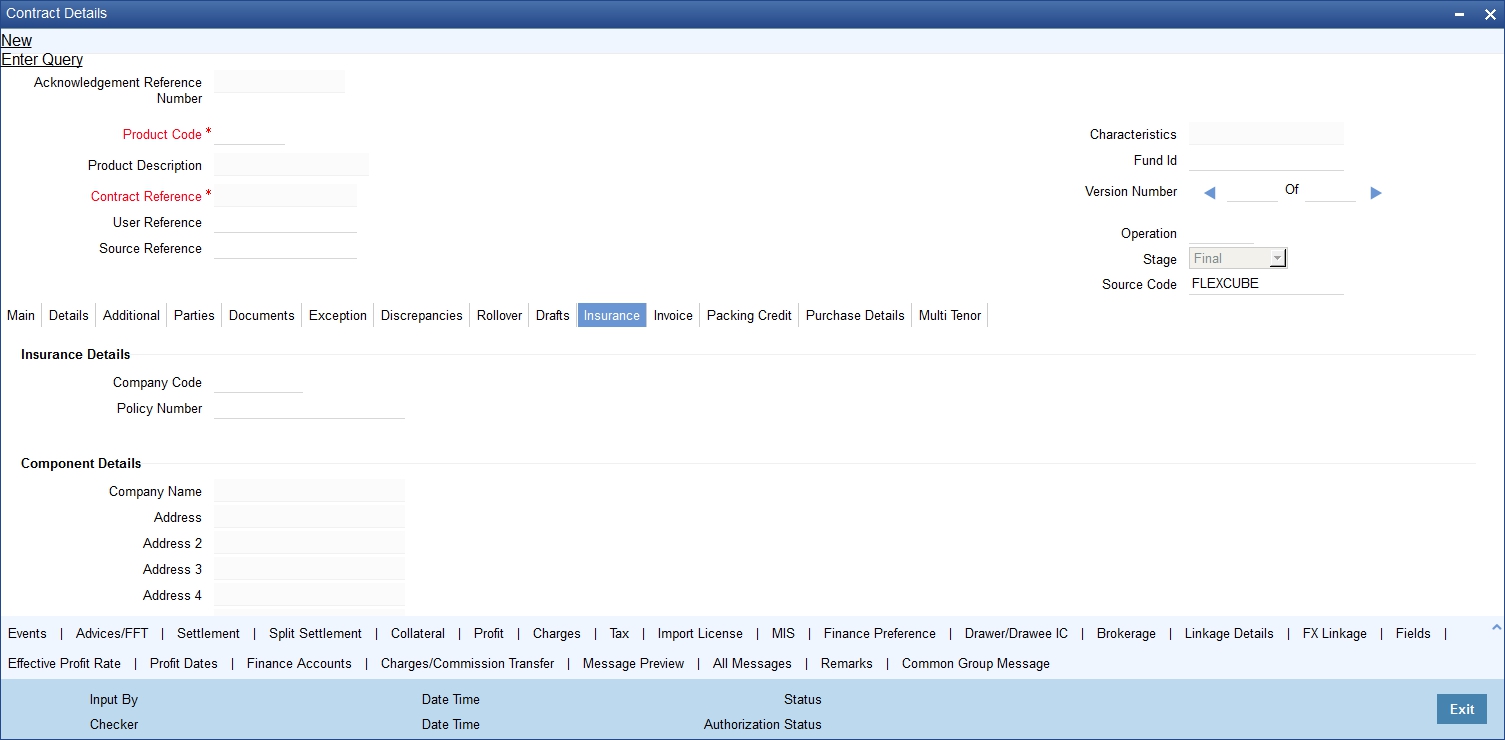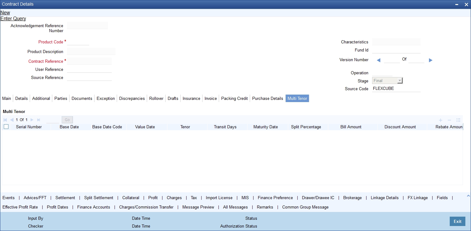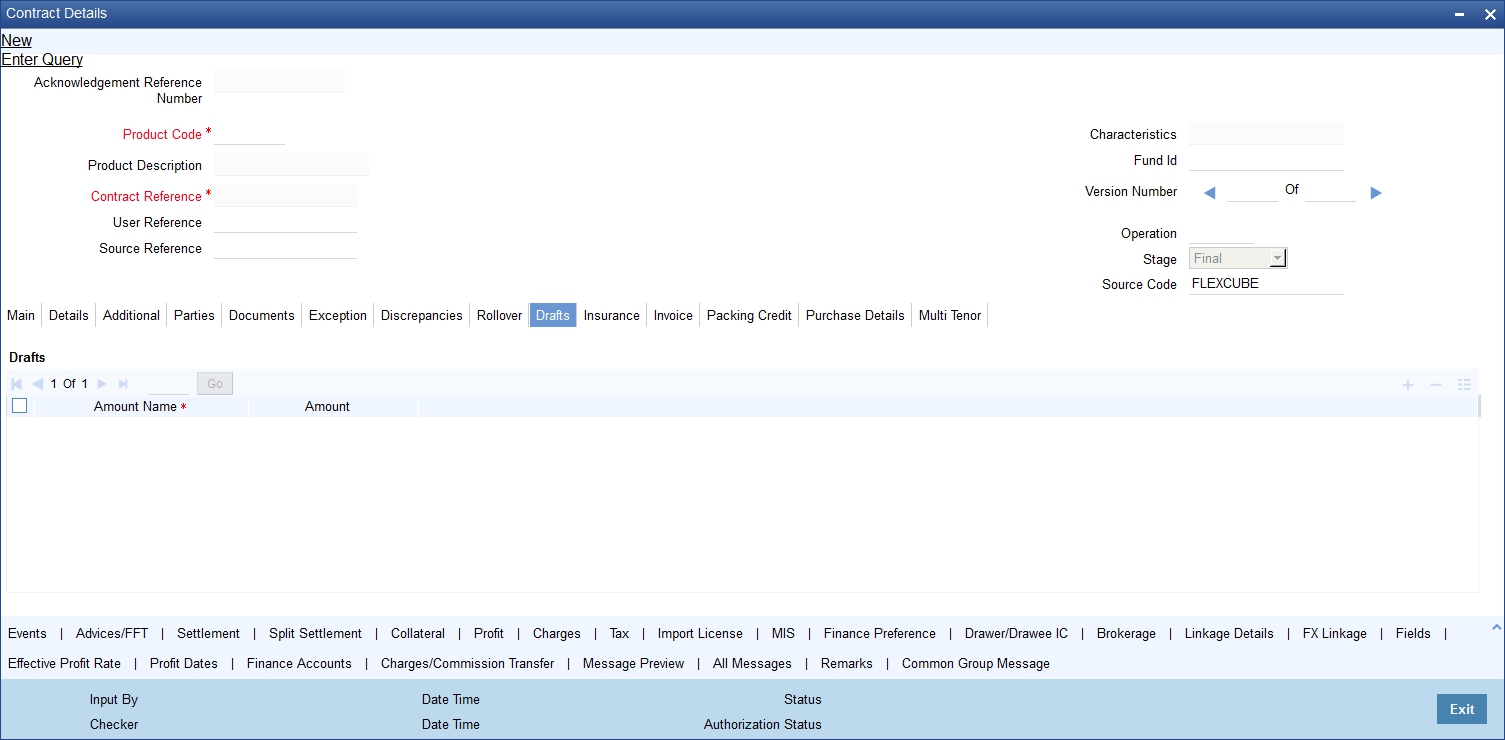 The ‘Islamic Bills and Collections Contract Detailed’ screen is designed to contain 11 tabs along the lines of which, you can enter details of the contract. The 11 tabs are: