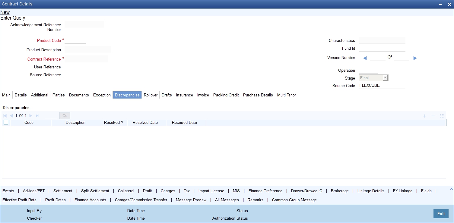In the screen that corresponds to this tab, you can enter details of the discrepancies that occur while processing the bill. The screen also captures details of the tracers that should be generated for Reserve exceptions. |