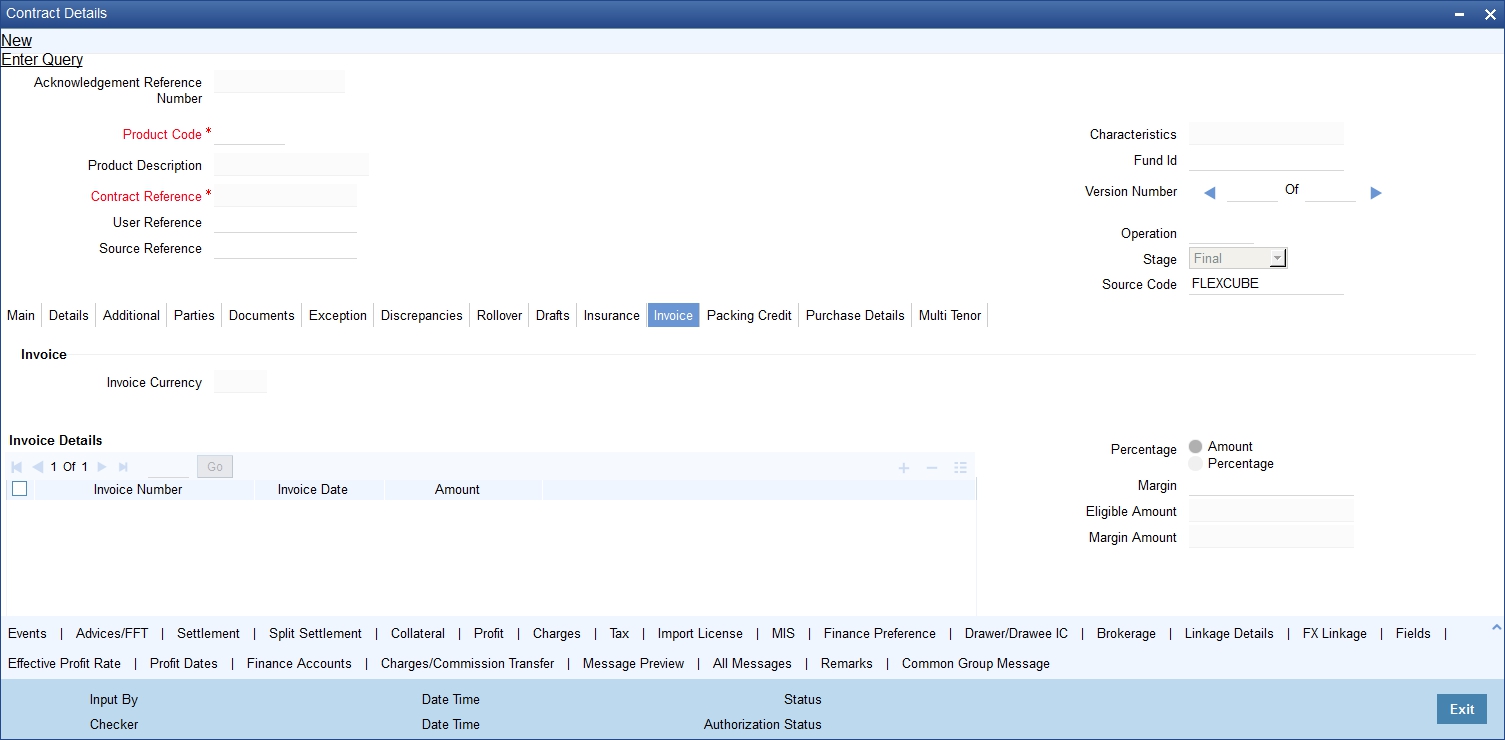Click this tab to define the invoice margin that should be withheld whenever an invoice is raised against a discounted bill. |