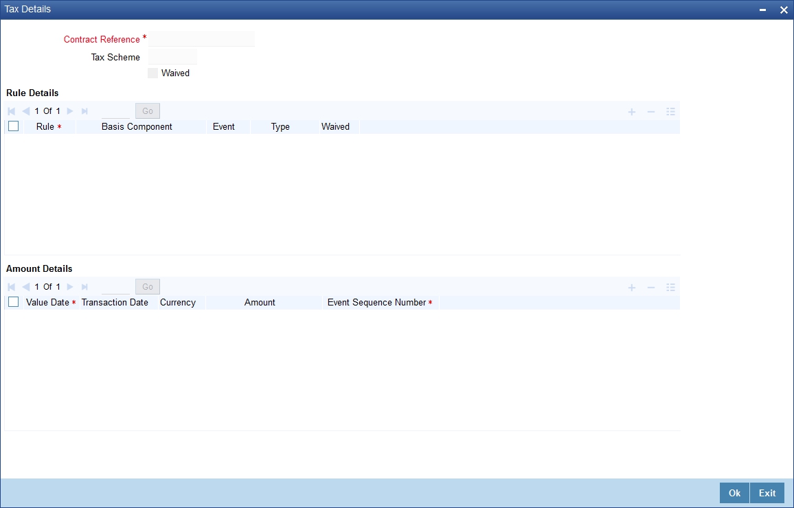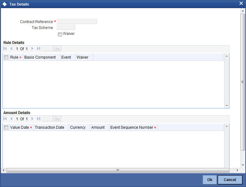 Click the ‘Tax’ button to invoke the ‘Tax Details’ screen. Through this screen you can manage tax details you are creating.