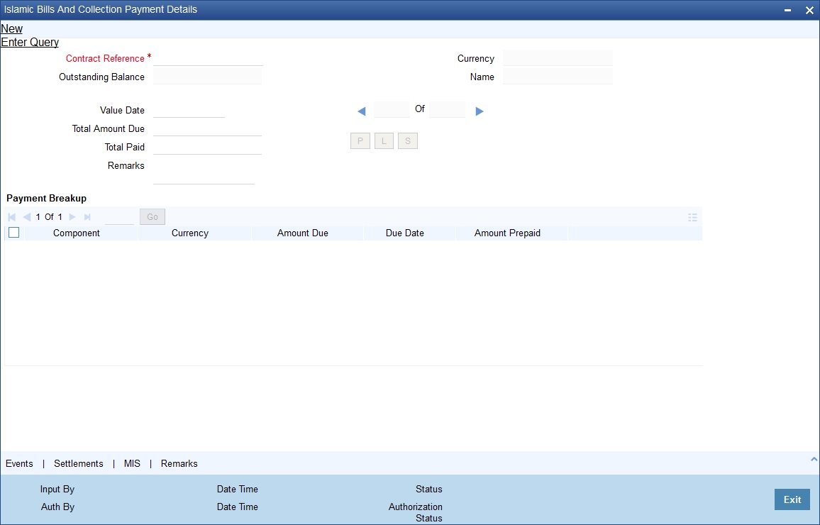 You can invoke the ‘Islamic BC Payment Input’ screen by typing ‘IBDTRPAY’ in the field at the top right corner of the Application tool bar and clicking the adjoining arrow button.