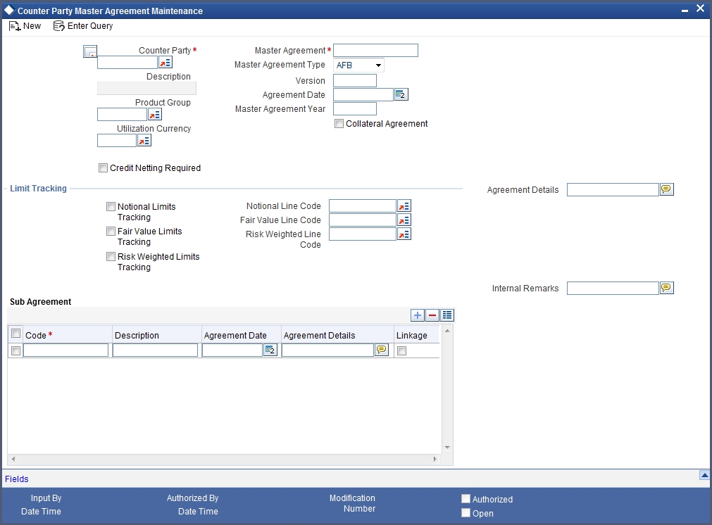 If you are maintaining details of a new master agreement, choose ‘New’ from the Actions Menu or click ‘New’ icon from the tool bar. The ‘Counterparty Master Agreement Maintenance’ screen will be displayed without any details.