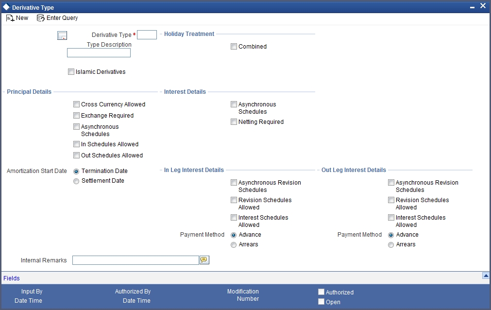 The difference between this module and the other modules in Oracle FLEXCUBE is that before you begin to maintain products you are required to define Derivative types. In maintaining derivative types you can broadly classify the derivative instrument as a CCS or IRS.
