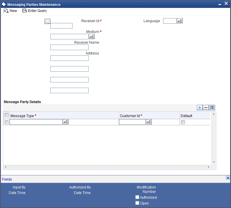 If you are maintaining details of a new receiver on behalf of the counterparty choose New from the Actions Menu or click ‘New’ icon from the tool bar. The ‘Messaging Party Maintenance’ screen will be displayed.
