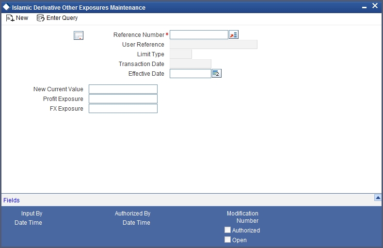 You can track the current value and exposure details of a counterparty using the ‘Islamic Derivatives Other Exposures Maintenance’ screen. You can invoke this screen by typing ‘IDDLMVAL’ in the field at the top right corner of the Application tool bar and clicking the adjoining arrow button.